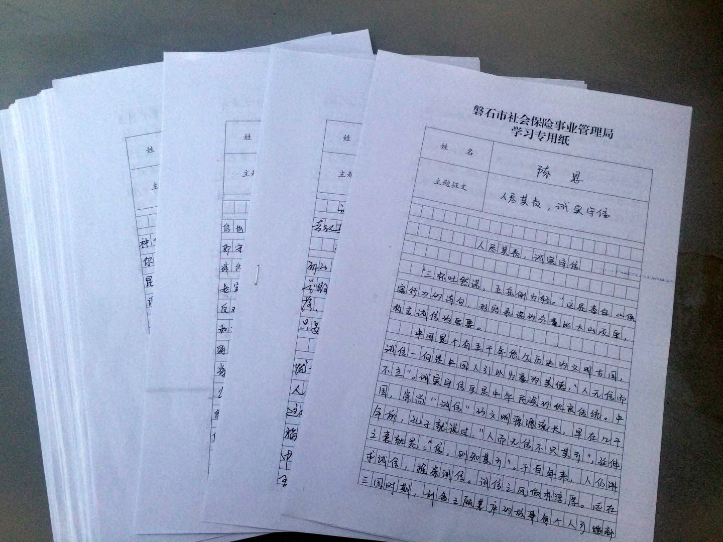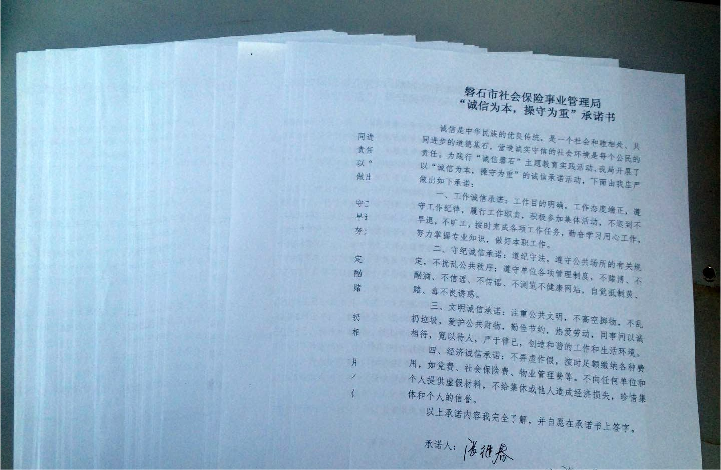 在磐石市社保局全局范围开展“以诚信求发展 以发展励诚信”主题讨论,并通过撰写心得体会、征文,签订《诚信承诺书》等活动引导干部职工立足岗位践行诚信规范,培育和弘扬诚信文化,树立诚信意识,做诚信党员干部。