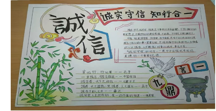 (四)出版“诚信教育”主题黑板报。为进一步营造诚信教育的良好氛围,各班出了一期以“诚信”为主题的黑板报,同学们在老师的指导下精心绘制图案,摘抄相关的“诚信”名人名言,把“诚信”深刻地记于心中。